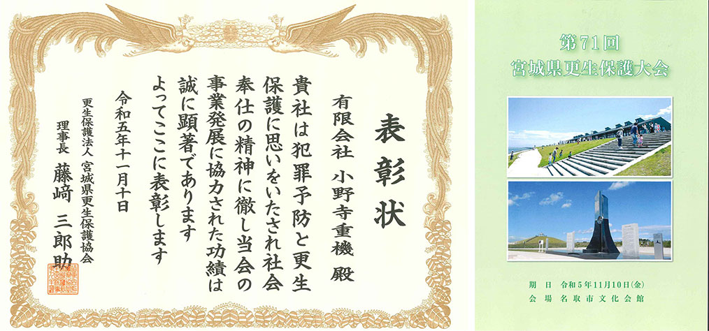 2023年11月10日に、小野寺重機の活動・取り組みに対し宮城県更生保護協会より表彰を受けました。