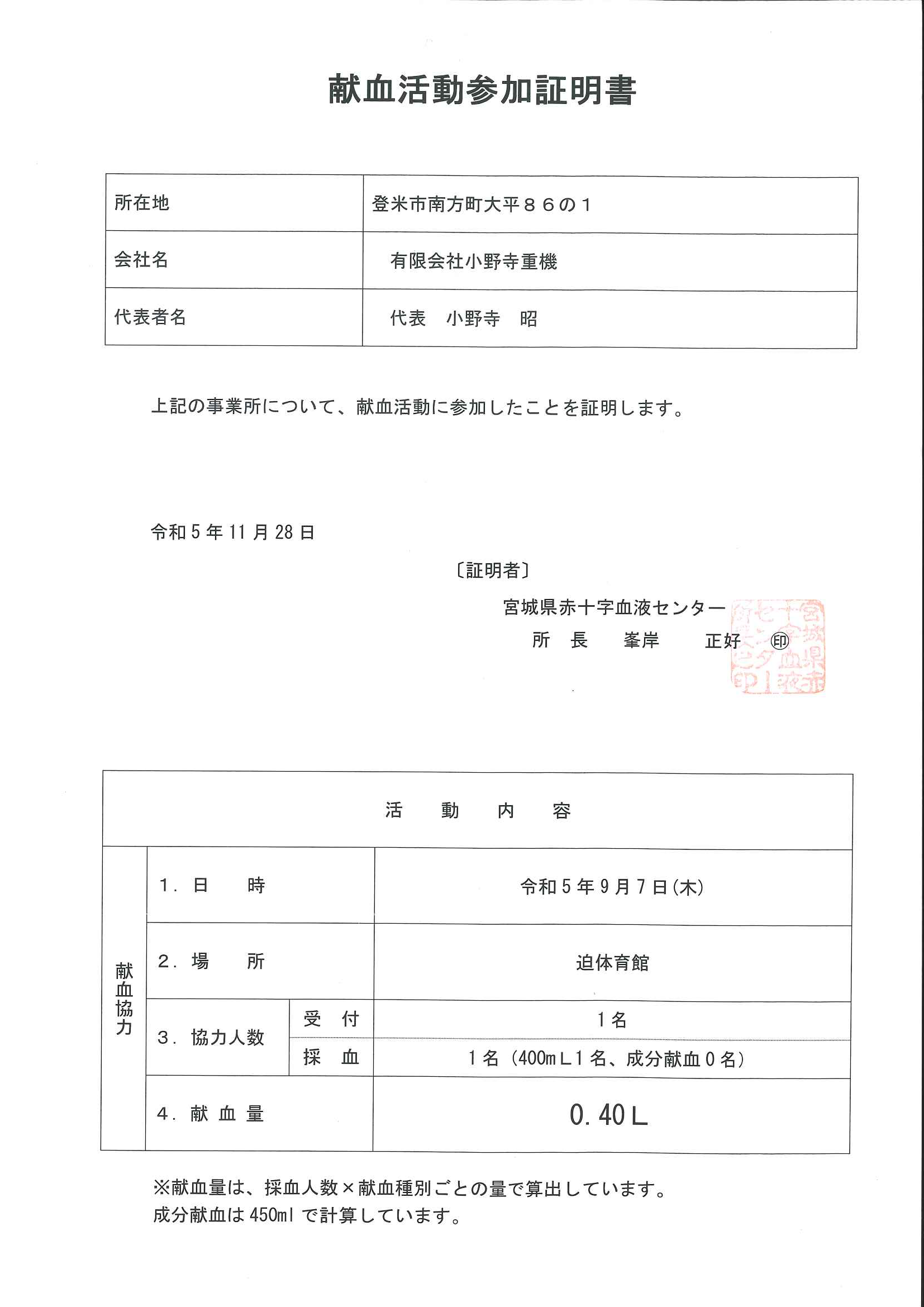 宮城県赤十字血液センターより献血活動への参加証明書をいただきました。