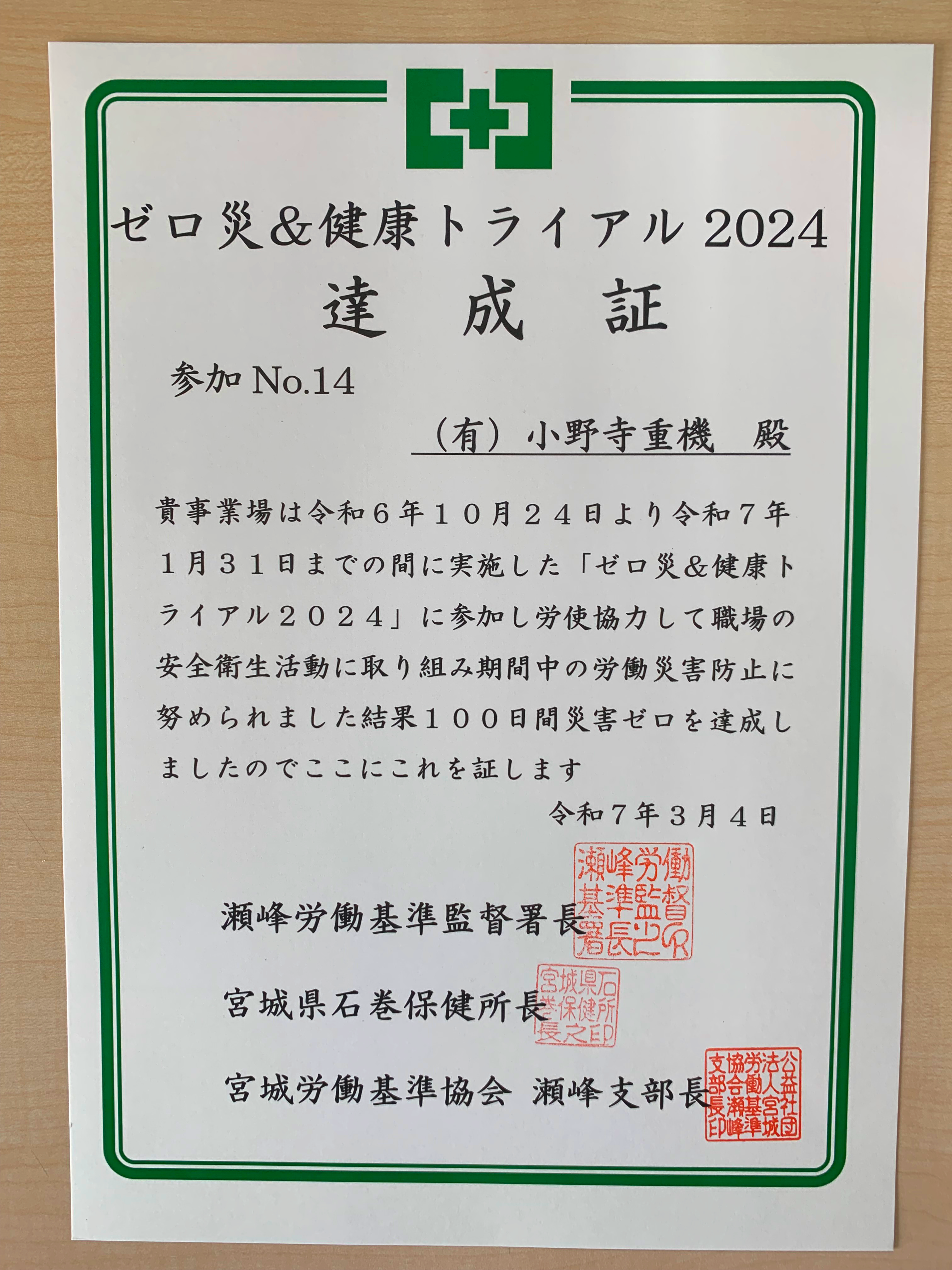 栗原・登米地域の事業場を対象とした「ゼロ災&健康トライアル」に参加し、令和6年10月24日(木)から令和7年1月31日(金)までの100日間、災害ゼロを達成しました。