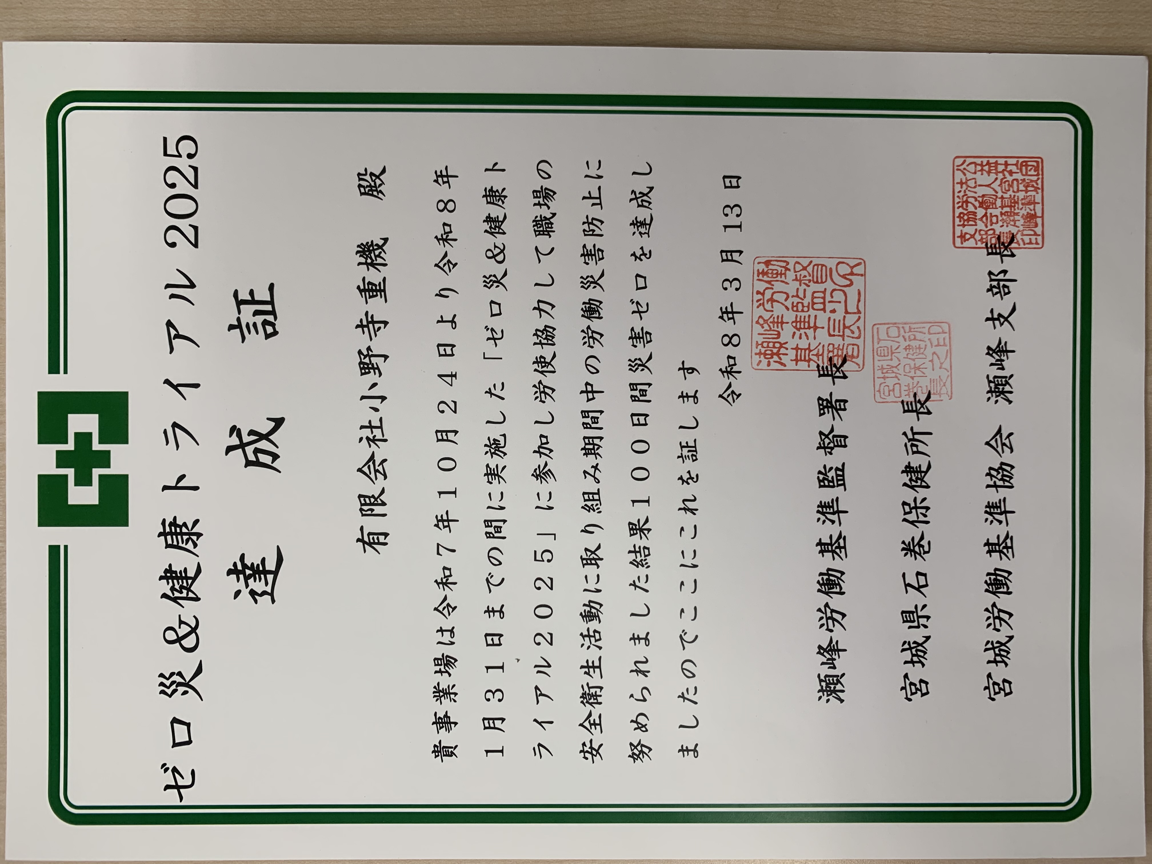 栗原・登米地域の事業場を対象とした「ゼロ災&健康トライアル」に参加し、令和7年10月24日(金)から令和8年1月31日(土)までの100日間、災害ゼロを達成しました。